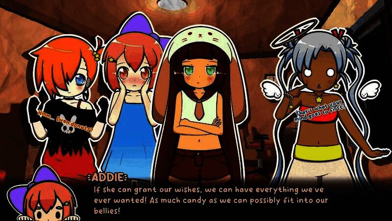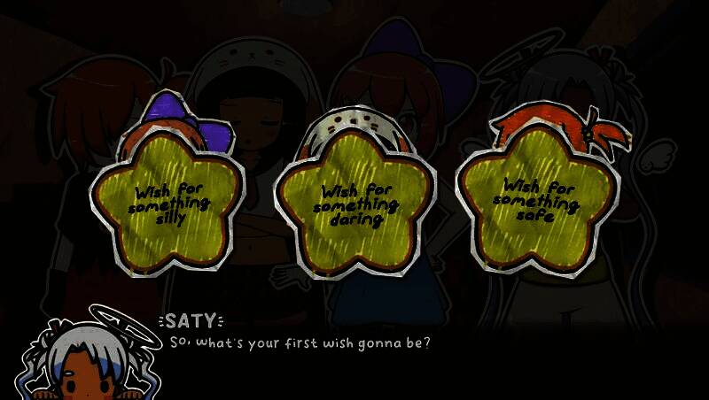 游戏围绕三位偶像妹妹展开:天然呆的艾迪、腹黑冷静的敏特,以及情绪复杂的忧郁乐观派艾米。她们在前往睡衣派对的路上遭遇流星坠落,邂逅神秘许愿者萨缇——她承诺用仅有的三个愿望实现她们的心愿。然而每个愿望都会叠加前一个效果,引发连锁反应,最终导向超过12种截然不同的结局,从友情破裂到世界被马桶统治,剧情走向完全出人意料,充满黑色幽默与奇幻色彩。