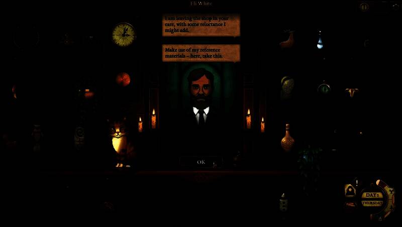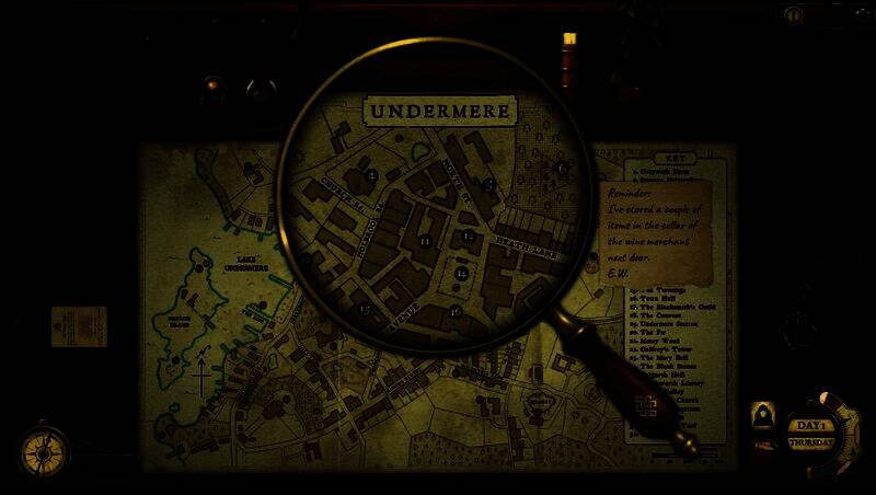 本作延续并升华了Bad Viking一贯的暗黑美学,采用精致的手绘美术风格,营造出阴郁却迷人的哥特式氛围。店内烛火摇曳,古籍插图细腻入微,窗外雨滴滑落街道,幽暗巷弄与昏黄灯光形成强烈对比。每一处细节——从古董表面的斑驳纹理到猫咪朱庇特轻盈跃动的姿态——都被精心刻画。配合环境音效如淅沥雨声、墙壁低语与远处钟鸣,进一步强化了“现实与异界交界”的不安感。光影层次更加丰富,手绘地图不仅具备功能性,更成为叙事的一部分,整体呈现出一种“诡异中带着治愈”的独特冒险基调。